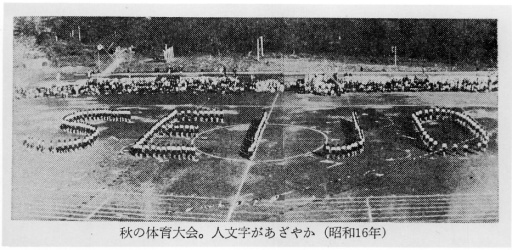 1922(大正11)年11月3日、明治神宮祭の日。13学級(小学校12学級、中学校1学級)、合わせて330名の児童・生徒が、青・緑・橙・黄組に組分けされ、3000㎡余の運動場に描かれた150メートルのトラックに集った。
