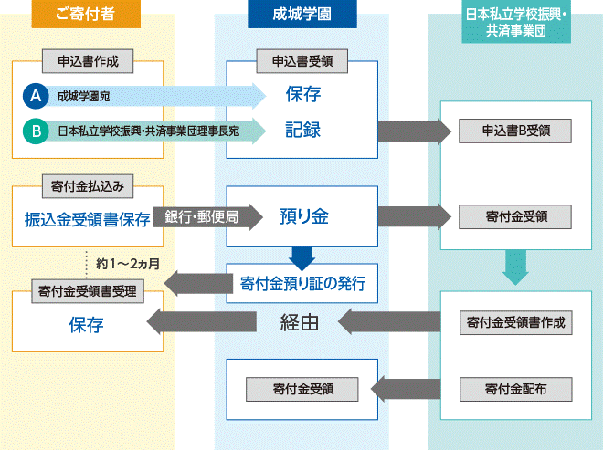 私立学校の教育研究の発展に寄与するため、日本私立学校振興・共済事業団を通じて、寄付者(企業等)が指定した学校法人(成城学園)へご寄付いただく制度です。