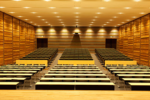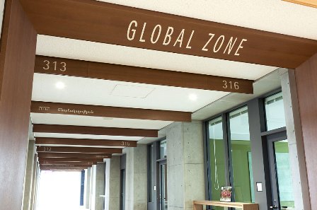 地下1階には木積層壁が広がるコリドー、図書室、カフェテリア、001教室(講堂)があります。「知の中枢」と位置付ける図書室と、生徒たちが集まり楽しむカフェテリアは隣同士。コリドーでつなぐことで「学習」と「コミュニケーション」をより密接にし、主体的な「自学自習」を目指します。教室フロアのルーバー(羽板を平行に組んだもの)には世界の名言や言葉が並び、地下1階のコリドーの壁にも数々の言葉が書かれていることから「ことば降り積もる学び舎」と表現。ことばが飛び交うコミュニケーションの活発化を図ります。