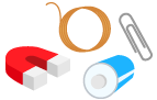 ゼムクリップ、じしゃく、エナメル線、電池。これだけで簡単なモーターが作れます。 さあ、どんなおもちゃが出来上がるかな?