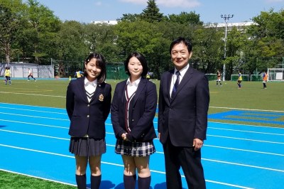 吹奏楽部に所属している二人ですが、勉強以外でも部活動や生徒会活動、学校行事にと何でも意欲的に取り組む姿勢に感心しました。完成したばかりのグラウンドで写真を撮った後、別れ際に「オファーがあれば、インタビューでも(学校説明会での)プレゼンでも何でも積極的にやります。」と笑顔で答えてくれました。この晴れやかな空と同じように、爽やかな気持ちにさせてくれる二人でした。