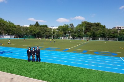 創立100周年教育環境整備事業も第1グラウンドの人工芝化工事が完成し、中高に関しては、完了となりました。グラウンドで走り回る大学生・中高生の姿が、実に生き生きしているように思えます。夜間照明も増設され、ライトアップされた人工芝は、更にきれいに浮かび上がります。工事期間中に活動が制限されていた学生・生徒諸君には、是非このグラウンドで更にスキルを挙げて活躍してもらいたいと思います。