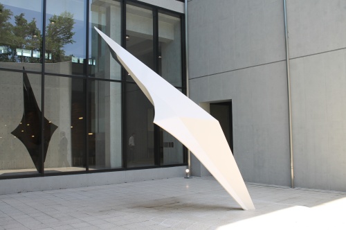 お披露目会には2013年から現在までの父母の会役員約60人が参加しました 。「抽象彫刻の彫刻家として活動する自分のところに制作の依頼があったことに非常に驚きました。情操教育に力を入れている成城らしいです」という高橋さんは「自分の作品を目にしながら日々を過ごし、何かしら感じ取ってくれたら嬉しいです」と挨拶。イタリアと日本を拠点に活動している高橋さんは、依頼を受けた昨春から設置場所の下見や構想と模型作りを経て夏ごろから制作に取り掛かり、7か月の制作期間を経てイタリアから船で運んできたそうです。「ありのままのまっさらな美しさを表現するのに作品を白く塗ることにこだわりました」という彫刻は、まぶしい初夏の太陽に照らされていっそう強く輝いていました。
