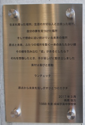 5月20日(土)、中学校高等学校のコリドー先のドライエリアに新しく設置された彫刻のお披露目会がありました。この彫刻は2013~2016年までの卒業生と父母の会による卒業記念品として、卒業生の彫刻家・高橋智力さんが制作したもの。タイトルはイタリア語で「針」を意味する「Lancetta(ランチェッタ)」。彫刻のプレートに刻まれた言葉は「自由な発想を大切にしてほしい」という想いから、あえて読んだ人それぞれがどんな形にも受け取れるようなメッセージになっています。