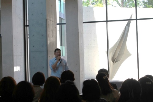 お披露目会で彫刻について語る高橋さん