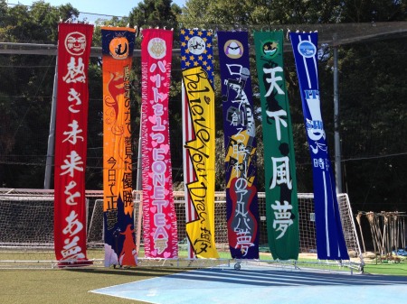 コリドー口を入るとすぐに授業展や文化部のさまざまな作品が展示されています。さらに進むと飛翔祭の7色の応援垂れ幕(画像は9月に撮影)が展示されています。1階から吊り下げられている垂れ幕の大きさと鮮やかなデザインが目を引きます。