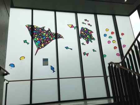 中央階段を登っていくと、踊り場の装飾が目に飛び込んできます。この飾りつけは外から入る光を上手く利用し、毎年見て楽しい装飾になっています。階ごとにデザインの違いがあり、手が込んでいます。そして東棟・西棟の各教室などでさまざまな企画が行われています。
