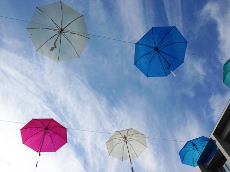 これは高3有志によるものです。このような展示をご覧になったことがある方もいらっしゃると思いますが、本校では初めての企画です。事務・用務職員の方に全面的に協力していただき、東棟と西棟を120本の色あざやかな傘が繋ぐ作品になっています。傘の持ち手の1つ1つにはメッセージが結ばれており、光の加減や見る角度によってさまざまな楽しみ方ができます。生徒たちは正面玄関前のこの作品の下で、盛んに撮影していました。