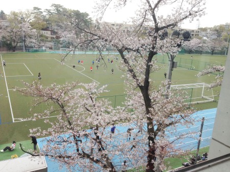 こんにちは。お彼岸を過ぎてぐっと暖かくなりましたね。曇り空の下、キャンパス内も千川沿いもソメイヨシノが満開です。第1グラウンドでは部活動に参加している生徒の姿が見えます。