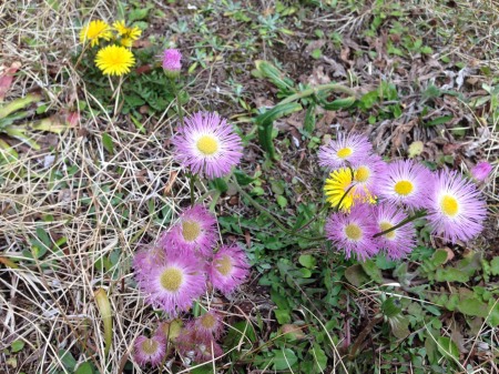 一面に広がるセイヨウタンポポに負けじと、ハルジオンも懸命に咲いています。そして、南棟近くのあまり日が当たらない所には、