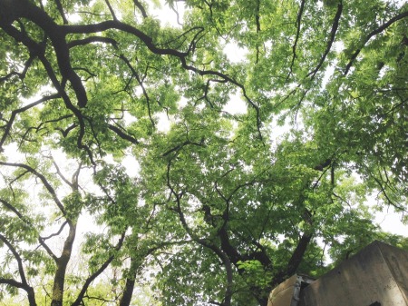 さて、4月も半ばを過ぎ、キャンパス内は一層色あざやかになりました。冬の間葉を落としていたクヌギの大木も、下から見上げると今ではこのようになっています。画像中央には一羽のヒヨドリがいて、何やらこちらの様子を伺っています。