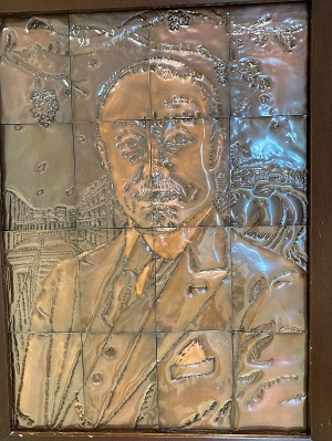 今回私が特におもしろいと思ったのは、金属板を使った作品群です。1つは銅板を熱した後、鏨(たがね)と金槌(かなづち)を使って叩いた作品です。16人の生徒が各々のピースを1つ作り、上下左右の人と協力しながら1つの大きな作品を作り上げています。担当の先生からお話を伺いましたが、背景に現在の中高校舎と昔の校舎が描かれているそうです。光沢のあるブロンズ色の作品は、その大きさも相まって圧倒的な存在感があります。
