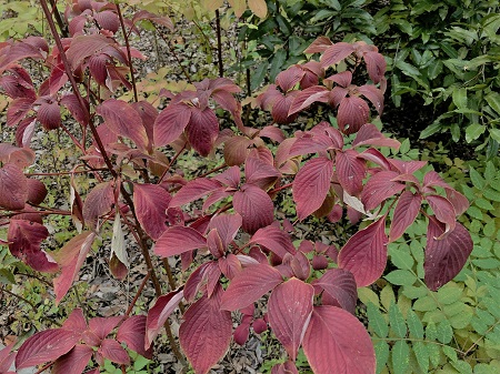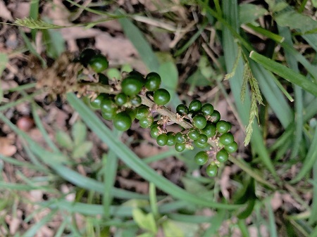 さて、以前にもご紹介したヤブランですが、中高エリアの何か所かに植えられています。グラウンドカバーにもよく使われるこの植物は、夏の終わりとともに薄紫の小さな花を密生させ、その後に黒い丸い実を付けます。今日はいくつかの株に緑色の実がびっしりなっていました。