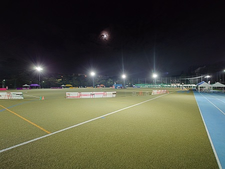 飛翔祭の前夜、帰りがけにグラウンドを撮影した。飛翔祭は生徒から選出される飛翔祭実行委員、体育委員、そして各色の応援団幹部ら多くの生徒たちの手によってつくられている。この時、遅くまで応援団の生徒たちが翌日のオープニングの練習をしていた。人工芝の広大なグラウンド、緑を照らす照明、そこに流れるボリューム小さめのリハーサルの音声。