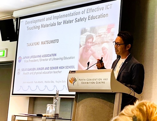 松本教諭は、成城学園中学校高等学校の保健体育科教諭として、そして公益財団法人日本ライフセービング協会副理事長として、当カンファレンスへの発表エントリーを行い、承認を受けました。昨年のスポーツ庁の実践研究校となった(※1)本学園のウォーターセーフティ教育や、日本初となる水辺の安全教育におけるICT教材の開発と実践を中心とし、これからの日本の水難事故防止教育の重要性に関する研究発表を行いました。他にもオーストラリアでのSwim&Survive教育の視察や、各国の水泳授業に関するワークショップにも参加しました。