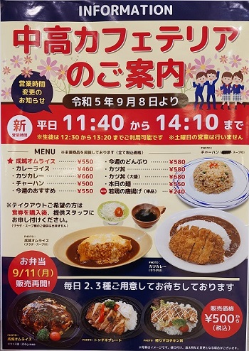 おおよそ想像もつくが、学校に入っている飲食業者さんの経営は厳しい。学校の暦に営業が左右され、定期テストなど昼食をとらずに終わることも少なくない。さらには春、夏、冬と長期の休みもある。以前その社長さんと話した折、「バイトさんがなかなか集まらなくてね…」とおっしゃっていた。一方で価格はそうそう高く設定できるはずもなく、けっこう大変なのだという。