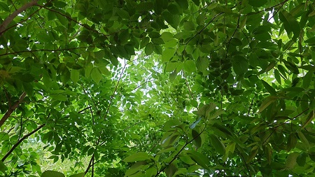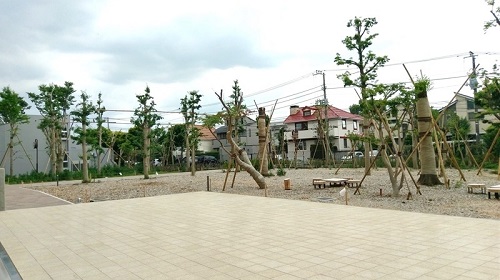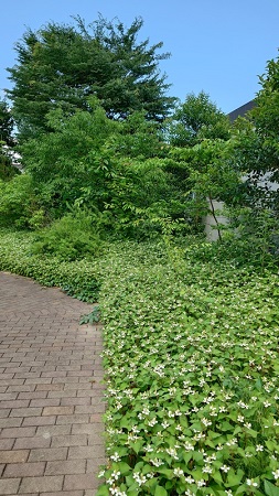 だが、植物の生命力は強い。7年を経た現在、まさに「緑深い森」へと進化を遂げている。造園業者による手入れも不定期に行われているが、この時期は鮮やかな新緑が生い茂り、メインエントランスから高校クラブハウスに抜ける通路の横では、いつから生え始めたのかドクダミの群生が可憐な花を咲かせている。木々の緑には、癒しの効果や目の負担を和らげる効果もあり、ふと疲れた目や心を癒す空間にもなる。