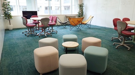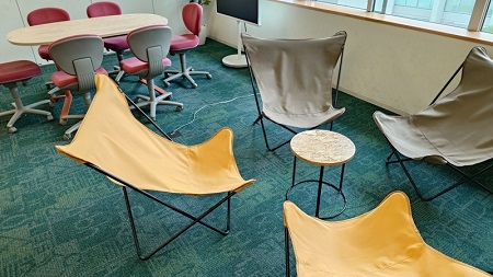 この Active Learning Zone の一角に、昨年度の卒業記念品として「ラウンジ」を整備してもらった。大きな円卓がふたつ、アウトドアで使うような布製のチェアや、スツールとサイドテーブル。プレゼンの確認や練習ができるようにと、43インチTVモニターも置いてもらった。生徒同士や、生徒と教員がコミュニケーションできる空間であると同時に、廊下側は全面ガラス張りのため、対面の中1教室の生徒の様子を見守ることができる。近年は「ラーニングコモンズ」という名前で、大学や図書館を中心に必須の空間として整備されているようだ。