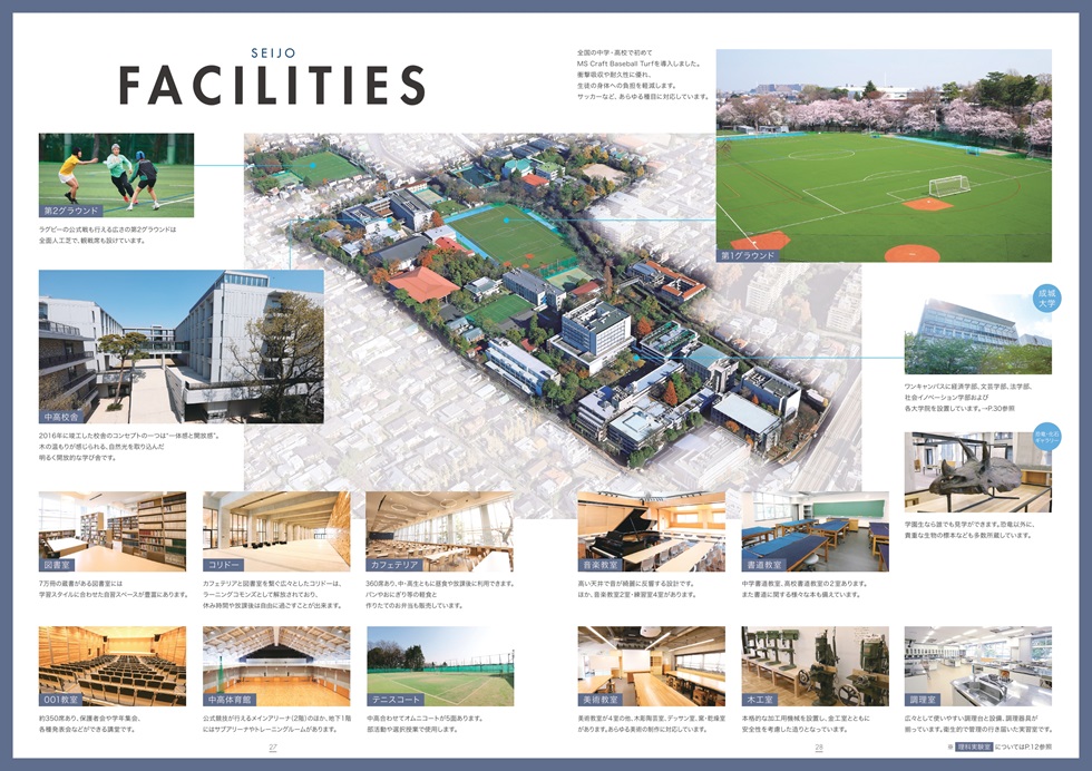 じゃあ先に成城学園の施設の話をしようか。これが成城学園の航空写真なんだけれど、成城学園がこの場所に移ってきてちょうど今年で100周年なんだ。この学校が新宿からここに移るまではここは雑木林でね、そこを切り開いて今の成城学園ができたんだ。だから、ほら、見てみて、サッカーと野球が両方できる第1グラウンドと、ラグビーの試合ができる第2グラウンドを学園の敷地の中に持っているし、中高専用のテニスコートも5面、バスケットボールの公式戦が2面で同時にできる大きな体育館も学園の中にあるんだよ。