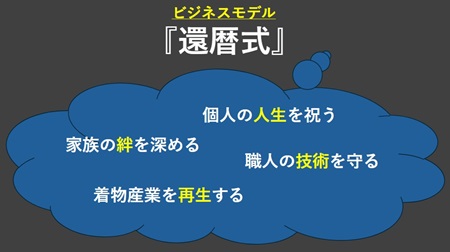 「ビジネスモデルとしての還暦式」。彼は日本の伝統文化の中でも「着物」に着目し、そのビジネスモデルを考案、提唱している。