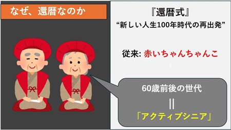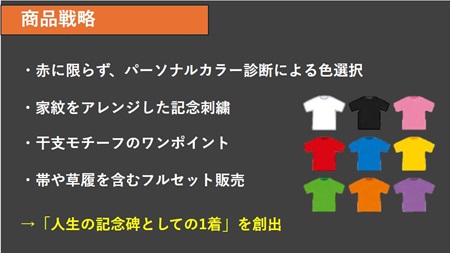 「若者にとって着物はいろんな意味で敷居が高い。価格も高いし、何か特別視している印象。だが、レンタル着物などのニーズはあり、関心が全くないわけではない。まずは着物産業の衰退を止めるために、アクティブシニアと呼ばれる、比較的余裕のある女性層をまずターゲットに据え、着物を買ってもらう機会としての還暦式の定着を目指す。それと着物を結び付けることによって、ビジネスとして着物産業の衰退を止めたい。そのことが、ひいては日本文化としての着物の存在を、若者や世界に広めていくことにつながる。」と。