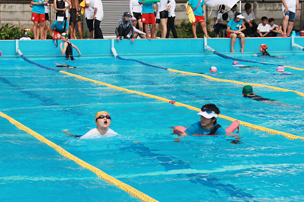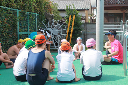 泳ぎの苦手な生徒の横について、一緒に泳ぎながら声を掛けることも。お兄さん、お姉さんからの言葉が心強い。