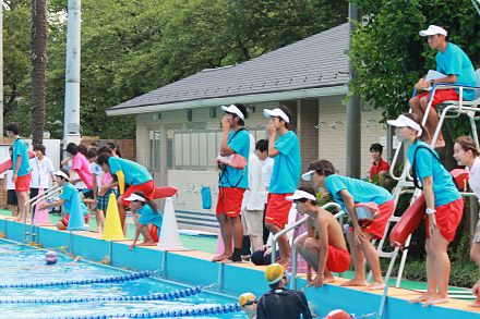 プールサイドには大声を出す高校生、大学生の姿。