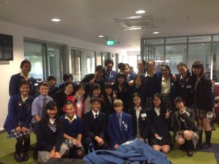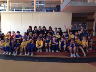 また、隣にある小学校の5年生のクラスを訪問。日本文化についてプレゼンし、折り紙やけん玉など日本の遊びを教えて交流しました。何だか、すっかり仲良しになったみたいですね。