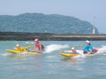 穏やかな富浦にしては珍しい最高の波!中学生は時間を忘れ,先生や高校生たちと一緒になり夢中で波乗りをしていました。