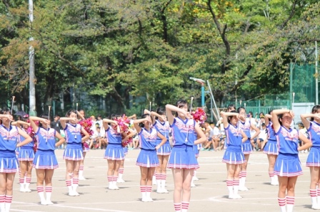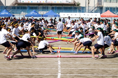 開会式では8色の旗を背に代表生徒による選手宣誓で運動会がスタートしました。今年のスローガンは「Over the Top!! ~さらなる高みを目指して!!~」。1年生8色、2・3年生は6色に分かれ、各チーム優勝を目指し白熱した戦いが繰り広げられました。競技種目以外でも、ブラスバンド部の演奏やバトントワラー部の演奏、オリジナルの振り付けで会場を沸かせた応援合戦、部活対抗リレーをはじめ、大変盛り上がった運動会となりました。