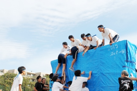 3年種目の~Over the Pig!!~。レース最後に待ち構える3mの壁を、クラスで協力して乗り越える!