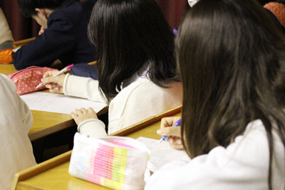 事前のアンケートでは「将来就きたい職業」に関して約65%の生徒が「希望を持っている」という回答が出ました。印象に残ったことをメモするようにとワークシートを渡されていた生徒たちは、必死に先輩たちの言葉を書き込んでいました。このような機会を通じて目標を明確にし、高校生活をより充実したものにしてほしいと思います。