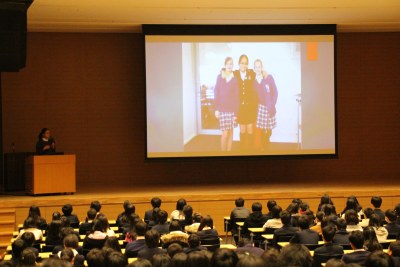 成城学園中学校高等学校では「広い視野で世界を捉える」という狙いのもと、中学校ではオーストラリア・パースのSt.Norbert Collegeへの短期留学、高等学校ではカナダ短期留学、アメリカ短期、長期留学(メリーランド州マクダナ校、カリフォルニア州ジェイセラ校)制度があります。今回は中学3年の夏にオーストラリア留学を控える中学2年生に、留学を体験した生徒2人からの経験談や昨年度の留学の様子などの説明がありました。
