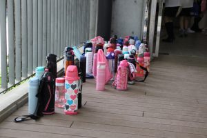 暑さ対策で水筒がズラリ