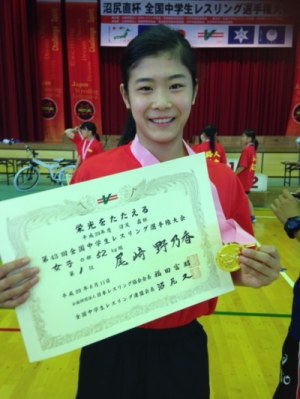 6月10日~11日に茨城県青柳公園水戸市民体育館で行われた『第43回全国中学生レスリング選手権大会』女子52KG級で中学3年柚組の尾﨑野乃香さんが見事優勝、昨年度の44KG級優勝に続く、全国大会二連覇を果たしました。今回も1回戦をフォールで勝ち上がると、決勝戦まですべてテクニカル・フォール勝ちという圧倒的な強さを見せての優勝でした。