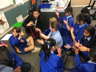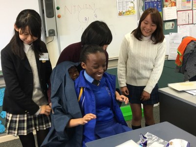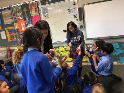 午後にはお隣の小学校のクラスを訪問し、離日前から準備してきた「日本文化の紹介」をグループごとにプレゼンテーションしました。紹介したのは、折り紙、あやとり、紙相撲、書道、二人羽織の5つです。プレゼンの後に声をかけると、小学生たちは競うように体験に参加してくれました。