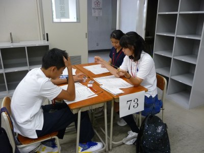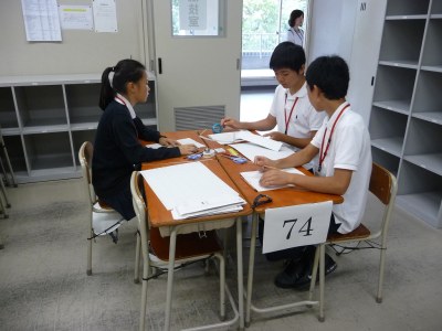 各校1チーム3名構成の3チームという大会規定に従い、中学校2年生の成績優秀者から参加希望者を募り、大会へ臨みました。大会は、250点満点ずつの筆記試験と実技試験で構成されていました。