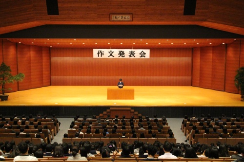 1年生から3年生までが1年間に書いた2000本を超える作文の中から、教員が9作品を厳選。作品が選ばれた2年生1人、3年生8人がそれぞれ自分の作文を朗読しました。試験終了後から作品を見直して練習してきたそうです。