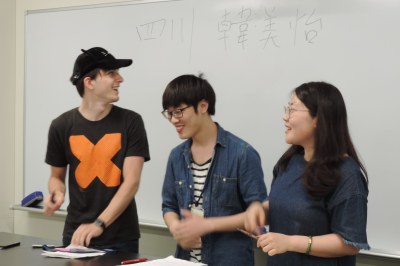 3名の留学生の朗らかな人柄で、楽しく中国語での挨拶と自身の名前の読み方などを指導していただきました。特に、四声に関しては中国語会話を学ぶ上で最重要にあたるもので、発音の違いを手厚く教えていただけたことで中国語への興味が増した生徒が多かったです。