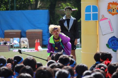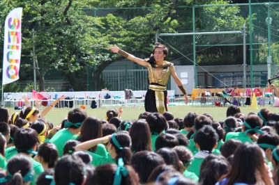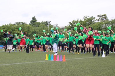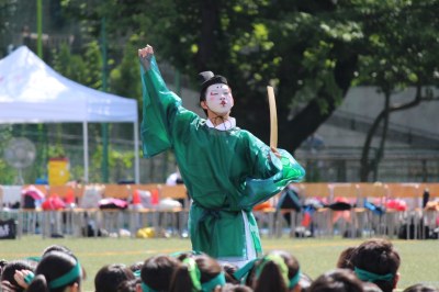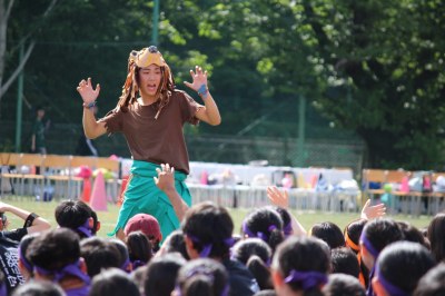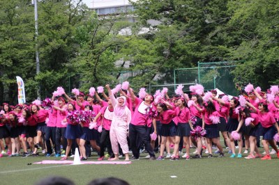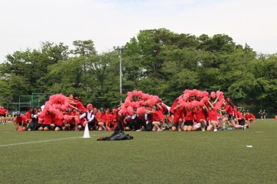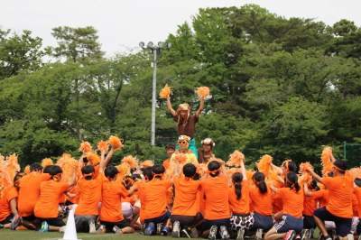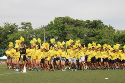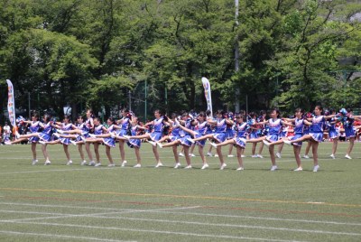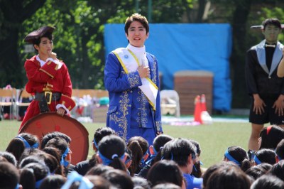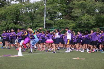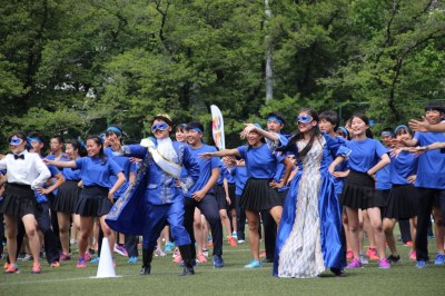 競技の熱戦はもちろんですが、飛翔祭の目玉は何といっても応援合戦です。それぞれのグループがテーマを決め、与えられた時間の中で歌やダンスを披露。内容のクオリティーはもちろんのこと、退場するまでの態度なども採点対象となり、グラウンドにゴミを落とすと減点になります。この日のために練習してきた生徒たちは学年の枠を越え、グラウンドの上でとても生き生きとしていました。