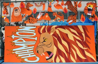 各グループの応援パネルとユニークな演出で登場した応援団長たち
