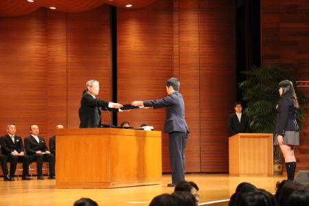 「おめでとう」の言葉とともに、クラスの代表が石井校長から卒業証書を受け取りました