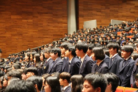 石井校長の式辞では「全て自己責任の覚悟で行動せよ」「他人の行動を自己責任だとあげつらうな」など、行動をおこす時に心の片隅に留めておいて欲しい言葉が贈られました。在校生の送辞では、先輩の頑張る姿から学んだこと、そして一緒に頑張る仲間の存在がいかに大切か、ということが語られ、先輩の存在に感謝の言葉が述べられました。卒業生の答辞では、飛翔祭での思い出と大学受験を通して気づいたこと、そして在学生には「自分の限界を決めないで挑戦してほしい」との言葉が贈られました。