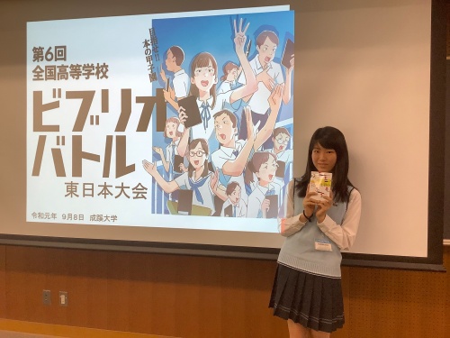 高校生がお薦めの本の魅力を語り、聴衆が最も読みたいと思った本に投票する書評合戦「第6回全国高等学校ビブリオバトル東日本大会」(活字文化推進会議主催、読売新聞社主管)が、9月8日東京都武蔵野市の成蹊大学で行われました。そこに3年 又村なおさんが出場しました。「本の甲子園」とも呼ばれるこの大会で『きのうの影踏み』(辻村深月著 角川文庫)をお薦めするプレゼンテーションを5分間行い、見事予選を突破。その後、決勝へと進み、優秀賞を受賞しました。
