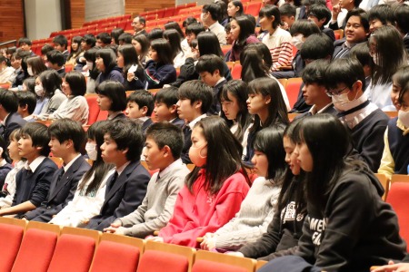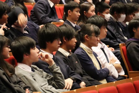 澤柳記念講堂を会場に、中学2、3年生約480名が卒業生の方々のお話に耳を傾けました。