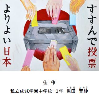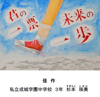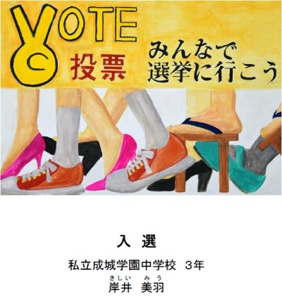中学校美術科では、授業で制作した作品を令和2年度「明るい選挙啓発ポスターコンクール」に出品しました。このコンクールには世田谷区全体では428点の応募があり、その中から、岸井美羽(3年)さんの作品が見事入選しました。 また、黒田音紗(3年)さんと杉本珠美(3年)さんの作品は、佳作に選ばれました。その後3人の作品は、東京都のコンクールへ出品されています。