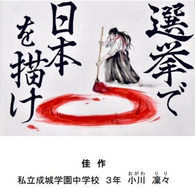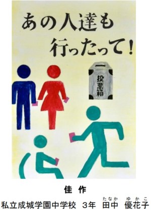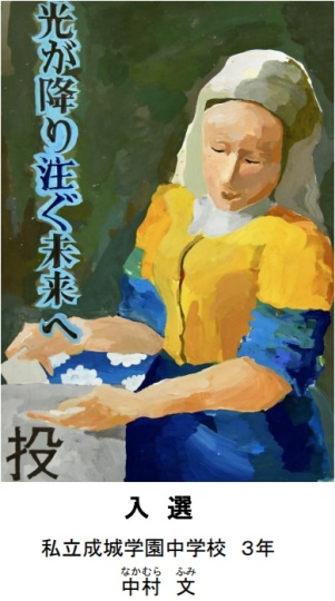 中学校美術科では、授業で制作した作品を令和3年度「明るい選挙啓発ポスターコンクール」に出品しました。このコンクールには世田谷区全体では435点の応募があり、その中から、霜鳥百花(3年)さんの作品が見事、特選に選ばれました。 また、入選に中村文(3年)さん、佳作に小川凜々(3年)さんと田中優花子(3年)さんの作品が選ばれました。その後4人に加えて、佐野梓(3年)さんと清水夢(3年)さんの作品が東京都のコンクールへ出品されています。