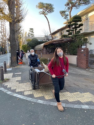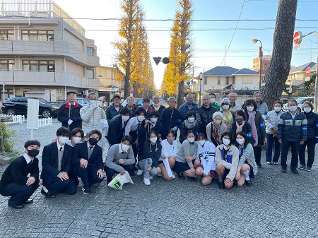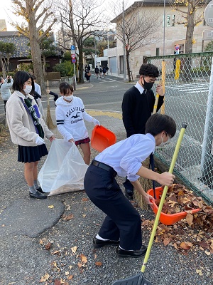 成城のイチョウ並木の落ち葉掃きに、高校ライフセービング部門の生徒たちが参加しました。 「綺麗なイチョウの木も、もうこんなにやせ細ってたんだー!」「いかに試験中で上を向いて歩いていなかったかだよね…笑」そんな会話からのスタートでした。