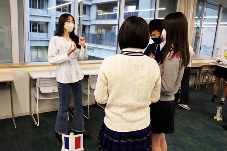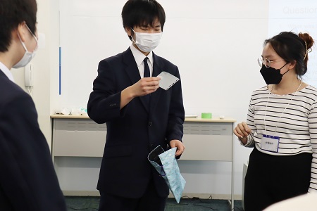 1日目は3つのゲームに挑戦。「Would you rather?(こっちかこっち?)」は「住むなら都市か田舎か」「夏か冬か」など参加者はどちらかを選んで、理由を英語で発表しました。「Hot potato bean bag(熱々お手玉回し)」はいろいろな質問が入った袋を回しながら、音楽が止まったときに袋を持っていた人が、袋の中の質問に答えるというもの。「新しいことに挑戦したのはいつ?」「趣味は?」など、どのような質問が飛び出すのかハラハラしながらも英語でしっかりと答えていました。最後はジェスチャーゲームでした。仲間が演じた動きをみて、答えがわかったら英語で書いて答えます。スピーキングだけでなくライティングの力も試されるゲームでした。