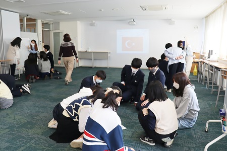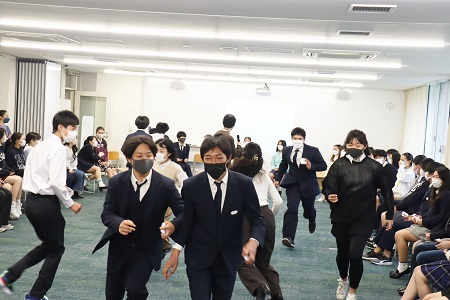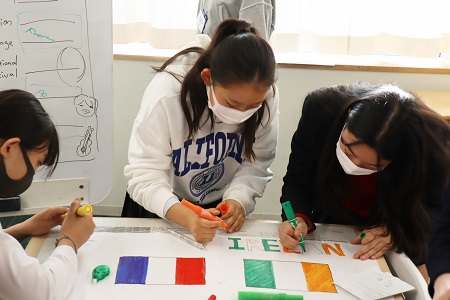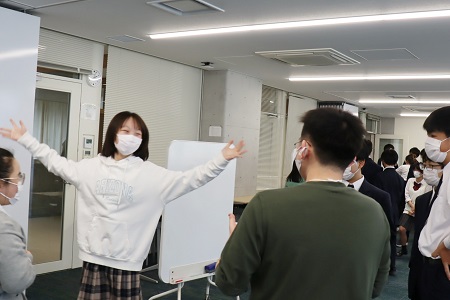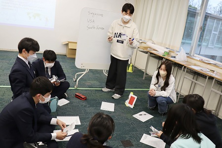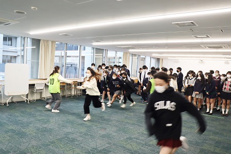 3月28日~30日の3日間、早稲田大学の学生サークル「セカクル」による英語プログラムを実施しました。コロナ禍により2021年度の短期留学は中止となり、国際交流のチャンスが失われた中、少しでも世界の人々と交流できる場を、という思いで今回初めて開催されました。参加者は中学1年38名、2年生34名、3年生16名の合計88名。韓国、アメリカ、台湾、ドイツなど様々なルーツを持つ「セカクル」メンバーの大学生とともにゲームやプレゼンテーションを通して英語に親しみました。プログラムのテーマは「Open Mindedness(広い視野を持とう)」。異なる環境で育った人々と理解しあい、共に生きるためのスキルとして英語を学びました。